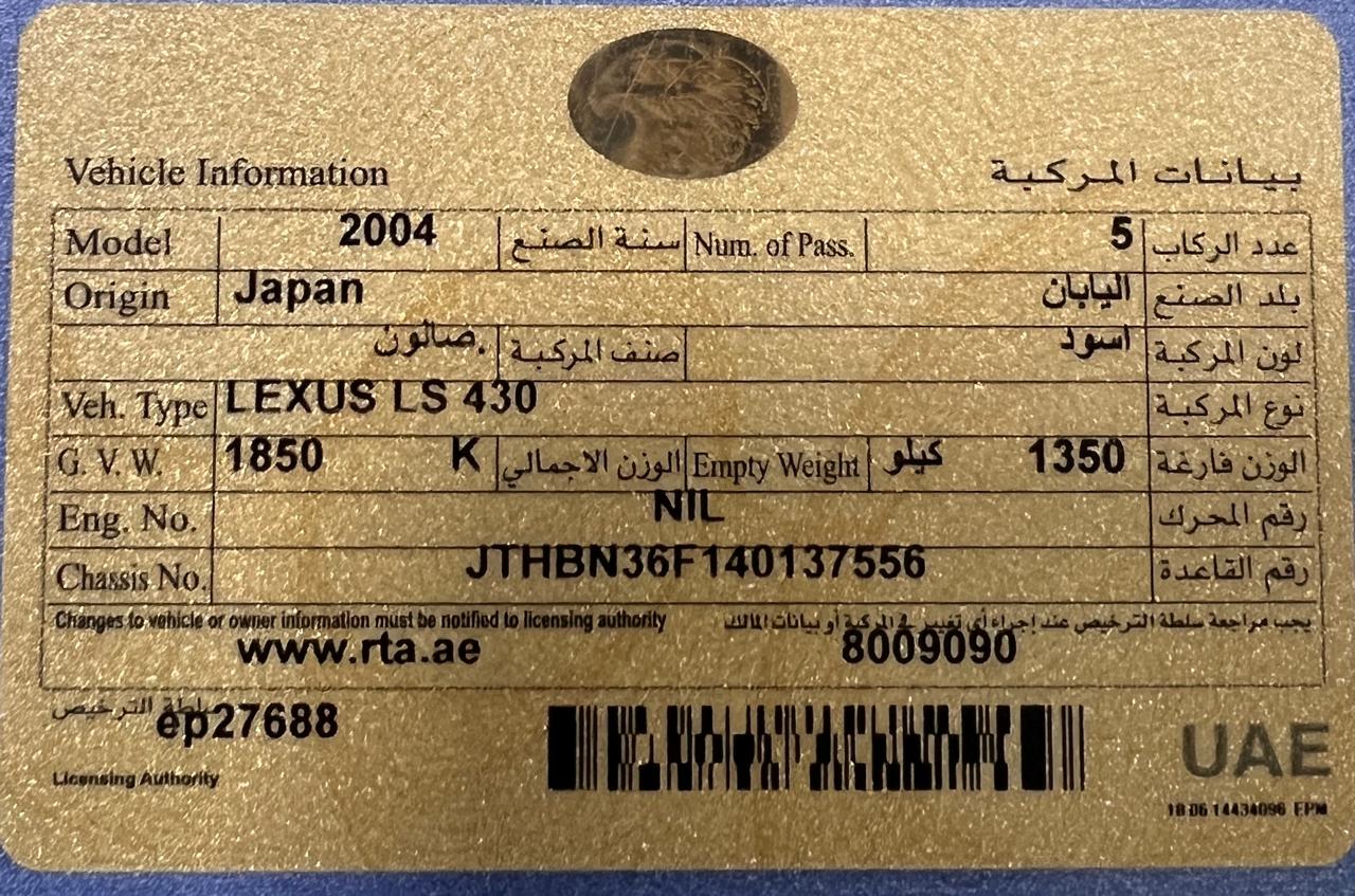2004 LEXUS LS 430 Half ultra Sale in Dubai – Excellent Condition, Dubai Reg. Kilometer 193000 Price & Negotiable: Price AED 18500