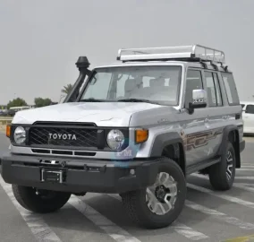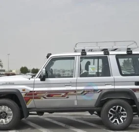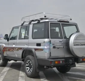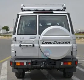 The 2024 model Toyota Land Cruiser 76 Hardtop LX-Z V8 4.5L Turbo Diesel 4WD with manual transmission offers a robust and versatile driving experience. Equipped with rear fog lamps, rear intermittent wiper, and rear window defogger, it ensures visibility in various conditions. Featuring swing type rear quarter glass and a black painted rear bumper with combination lamps, the exterior exudes functionality and style.