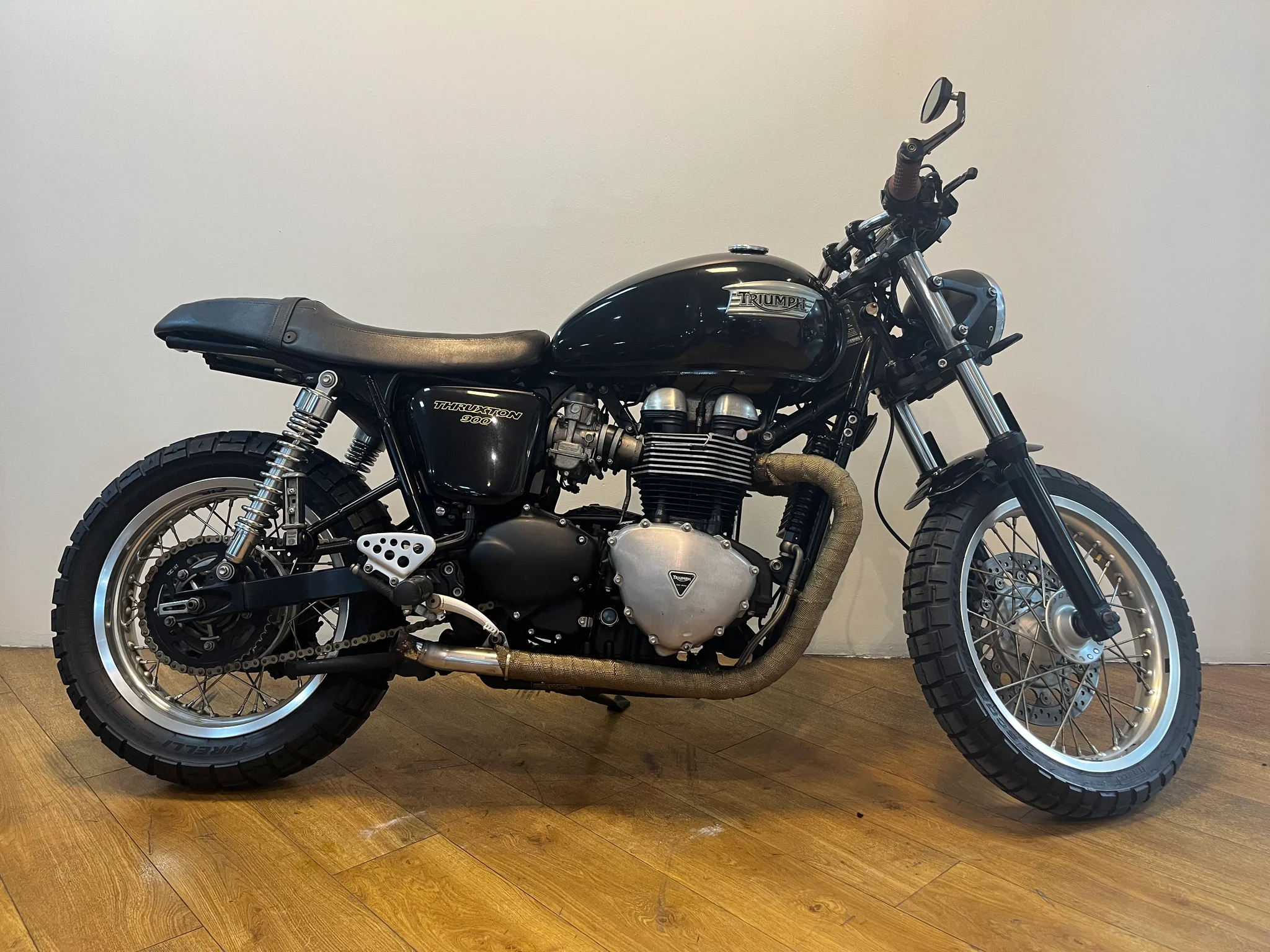 • Exhaust: Twin chrome "Megaphone" mufflers that deliver a sophisticated British bark.