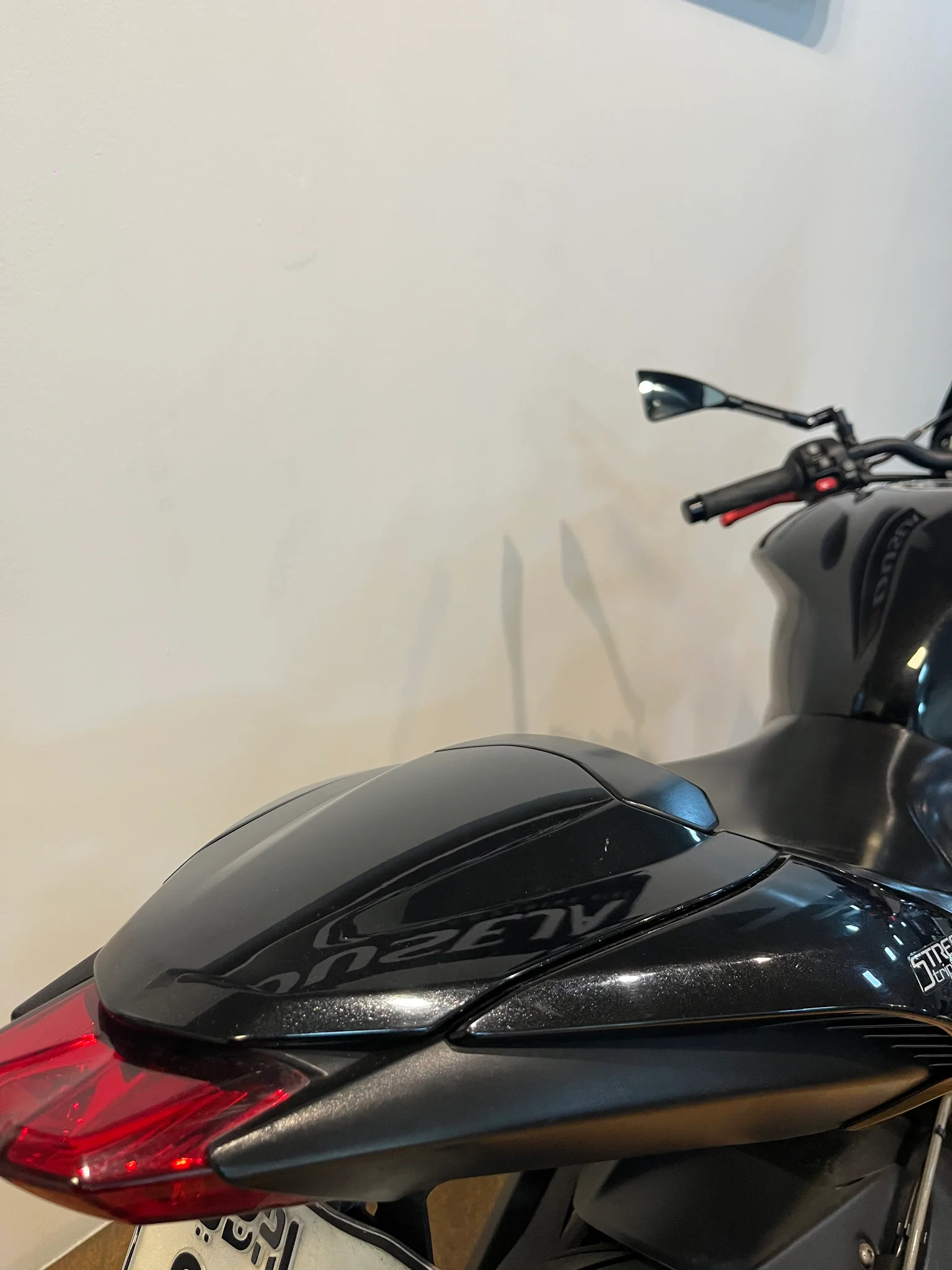 Rear Profile: Aftermarket Tail Tidy and a Triumph OE Rear Seat Cowl for a sharp, racing-inspired silhouette.