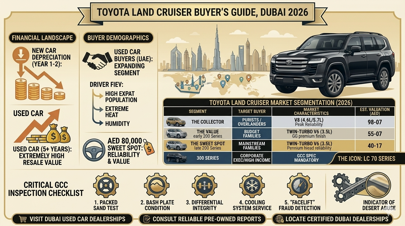 The Toyota Land Cruiser is one of the safest investments you can make in the UAE used car market. For daily use and desert adventures, the 200 Series V8 offers bulletproof reliability. For those who want the latest technology and better fuel economy, the 300 Series twin-turbo V6 is exceptional. Either way, always insist on GCC spec, verify the history, and negotiate based on mileage and condition rather than asking price alone.